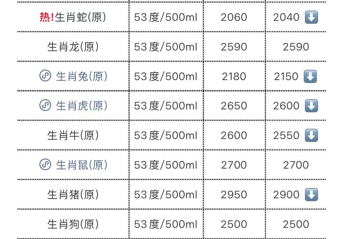 茅台生肖酒又见大面积跳水!酒类行情监测平台“今日酒价”公众号的数据显示,7月30日,“兔茅”报2150元/瓶鼎冠策略资,较前一日下跌30元;“虎茅”报2600元/瓶,较前一日下跌50元;“牛茅”报2550元/瓶,较前一日下跌50元;“猪茅”报2900元/瓶,较前一日下跌50元;“蛇茅”报2040元/瓶,较前一日下跌20元,再创上市以来新低。
