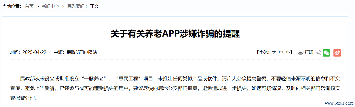 民政部:从未设立或批准设立“一脉养老”“惠民工程”项目 有关App涉嫌诈骗民政部:从未设立或批准设立“一脉养老”“惠民工程”项目 有关App涉嫌诈骗