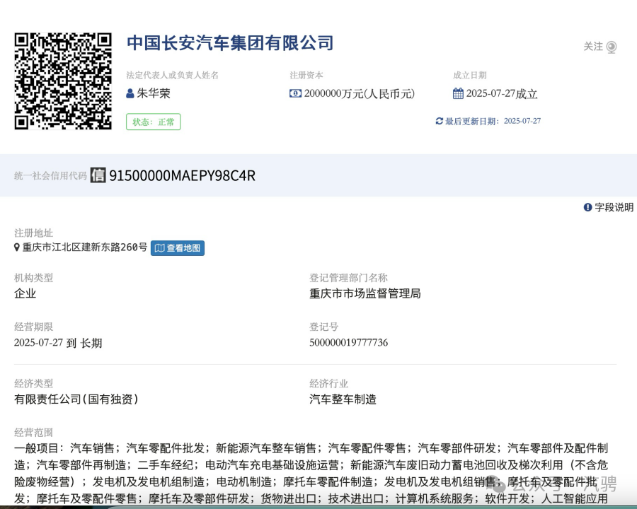 中国长安汽车是基于长安汽车、辰致集团(辰致汽车科技集团有限公司)、长安汽车金融等公司建立的汽车集团,拥有阿维塔、深蓝、长安启源三大新能源汽车品牌。7月27日,新公司在重庆市注册成立,注册资本200亿元,为国有独资企业。